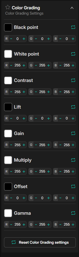 An advanced color grading tool is now available in the Post Process tab. Designed for professional workflows, it offers precise control over image color through settings such as white point, gamma, gain, and multiply.