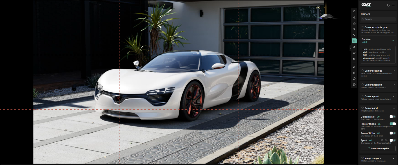 Special Note : The overlay image is positioned in the browser, so resizing the window can misalign it with the render. For the best results when using Image Compare, keep your browser in full-screen mode while matching the camera to your reference.