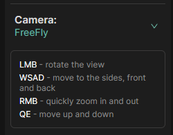 Freefly- The camera can be positioned using keyboard shortcuts WASD to move around the scene.