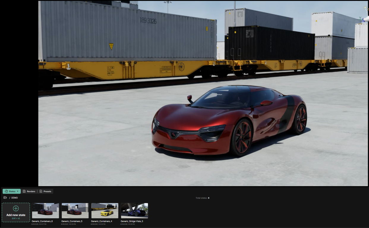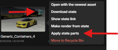 It is possible to transfer camera information from a State to the active session by using the Apply State Parts function found in the three bar menu of a State thumbnail.