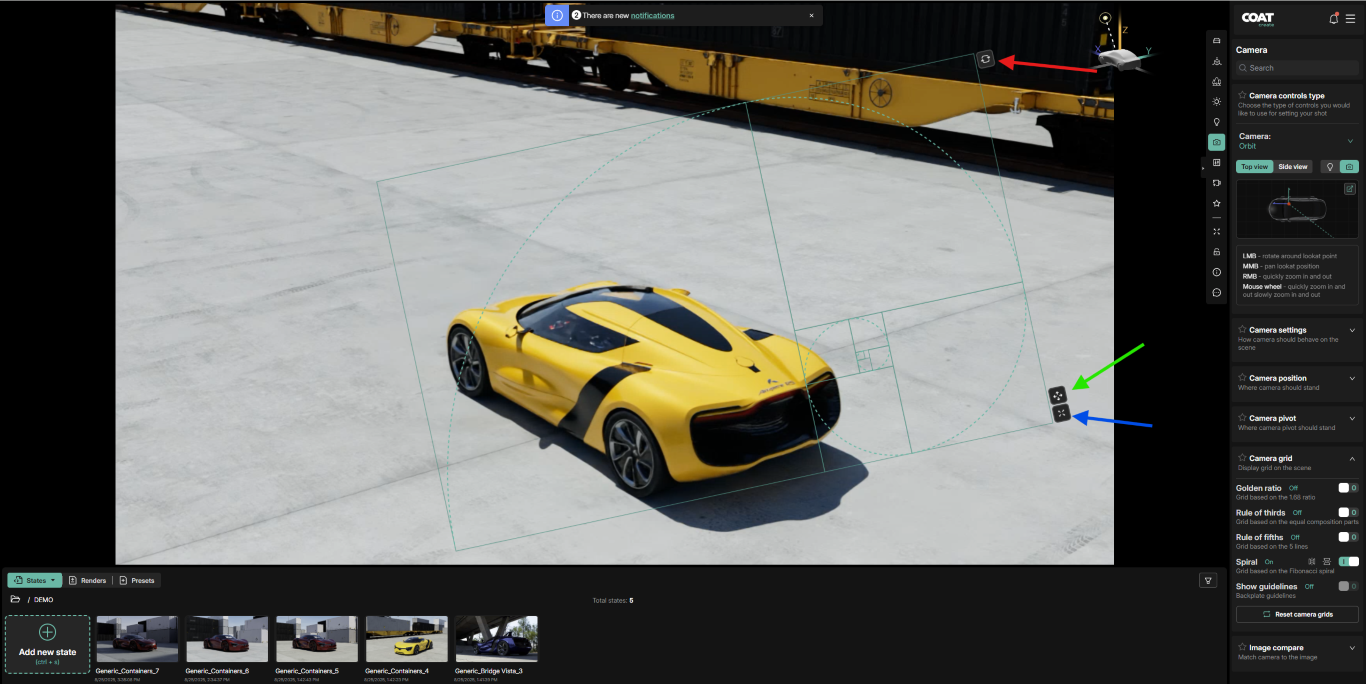 Orbit - The camera looks at the center point of the car "orbiting" freely around that center point.