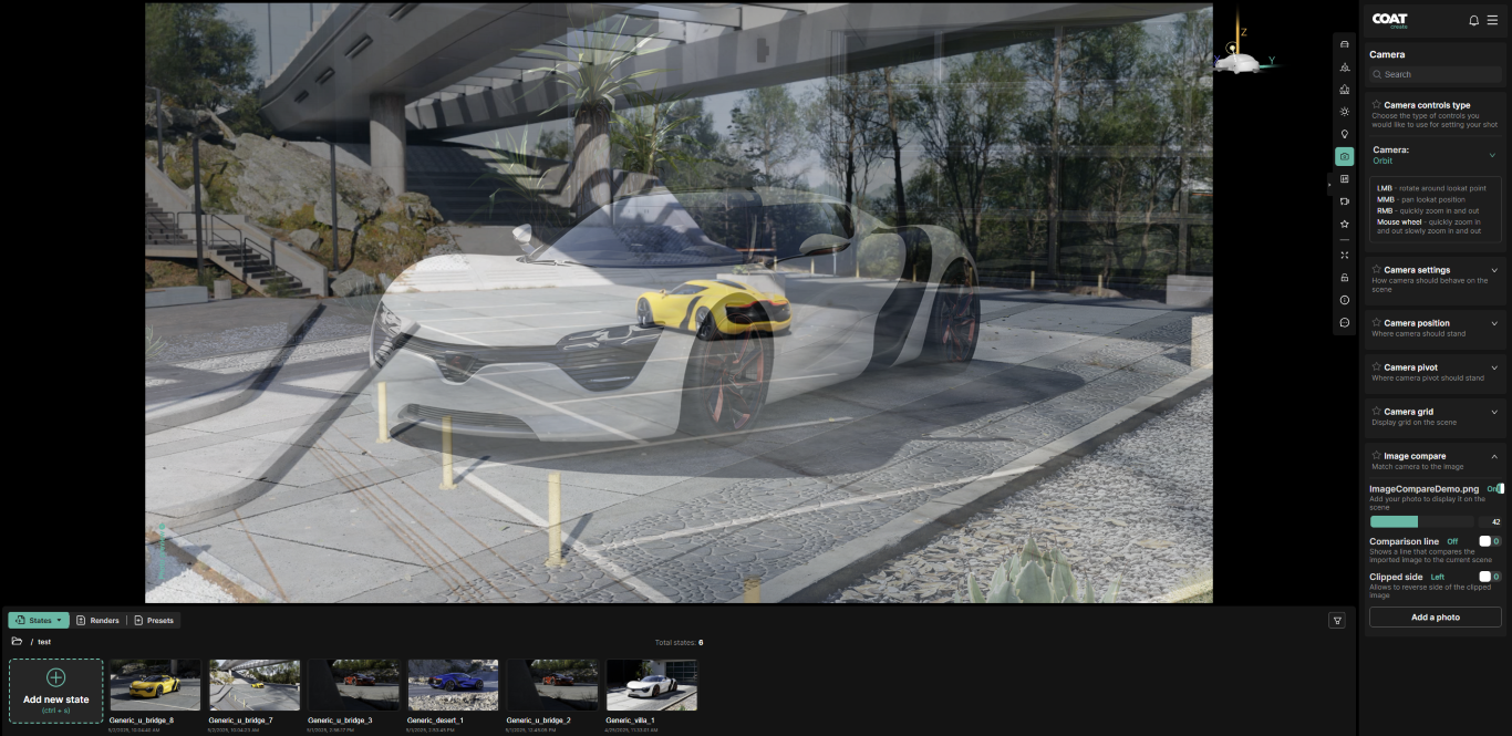 Special Note : The overlay image is positioned in the browser, so resizing the window can misalign it with the render. For the best results when using Image Compare, keep your browser in full-screen mode while matching the camera to your reference.