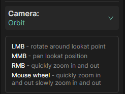 Keyboard combinations and mouse button control explainations will be displayed below the selected camera type. examples below.