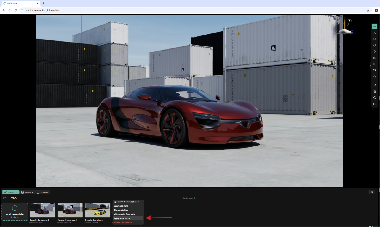 It is possible to transfer camera information from a State to the active session by using the Apply State Parts function found in the three bar menu of a State thumbnail.