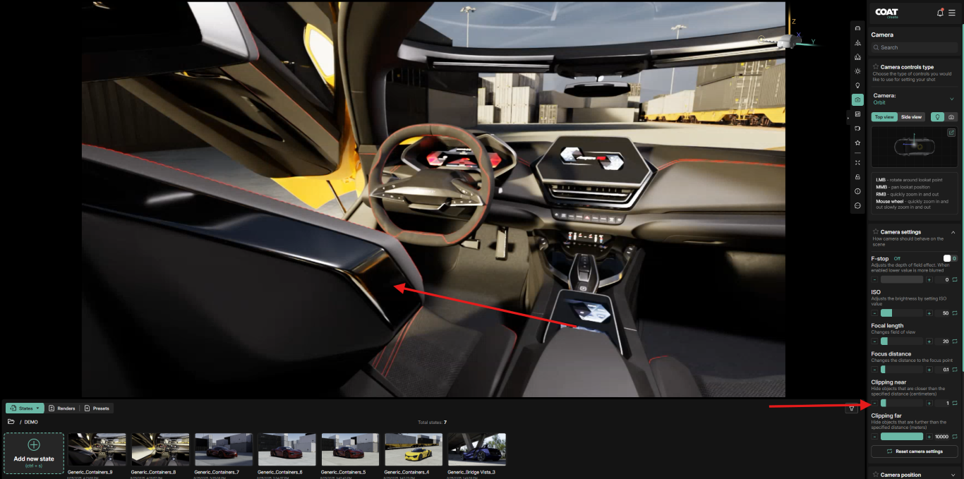 Orbit - The camera looks at the center point of the car "orbiting" freely around that center point.