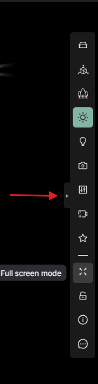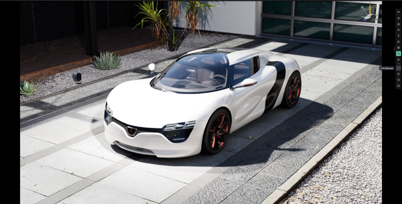 The viewport to fill the available space on your display. The right hand menus and tray at the bottom of the interface will not be visible. While in full screen mode the viewport will still react to user input such as orbiting, dollying and panning the camera.