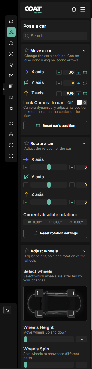 For more precise positioning, use the numeric input fields in the menu roll-out. Each input field has a color-coded icon that matches the gizmo in the viewport, making it easier to understand and control movement. There is also the option to reset the vehicle's position.
