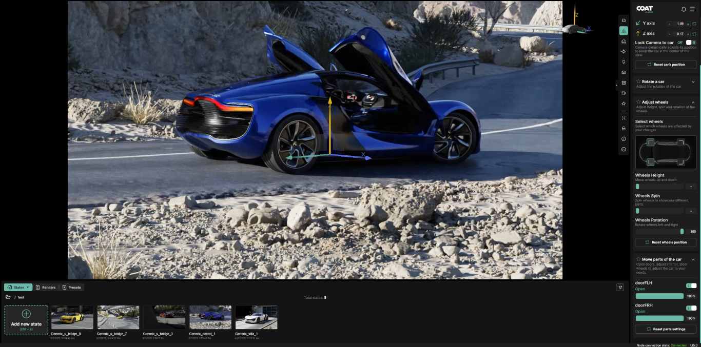 This panel lists all the car’s animated features, such as doors opening, seat positions, and steering wheel rotation. Each feature has a toggle to turn it on or off, and a slider to adjust it. You can also reset all animations with a single click.