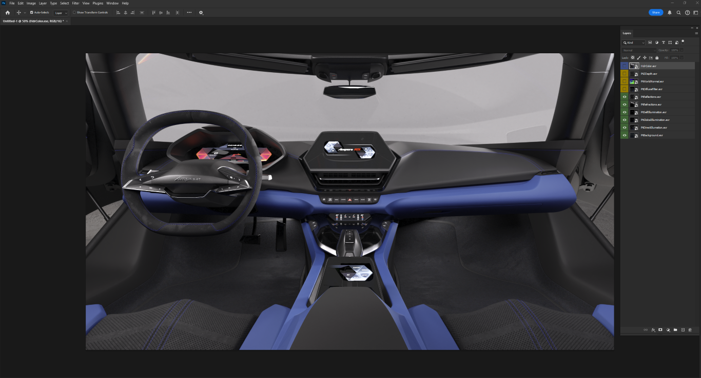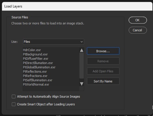 The resulting file should look like this. A 32 bit file with the AOVs loaded as individual layers.