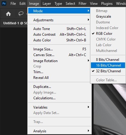 Choose Image > Mode > 16bit/Channel from the main menu bar