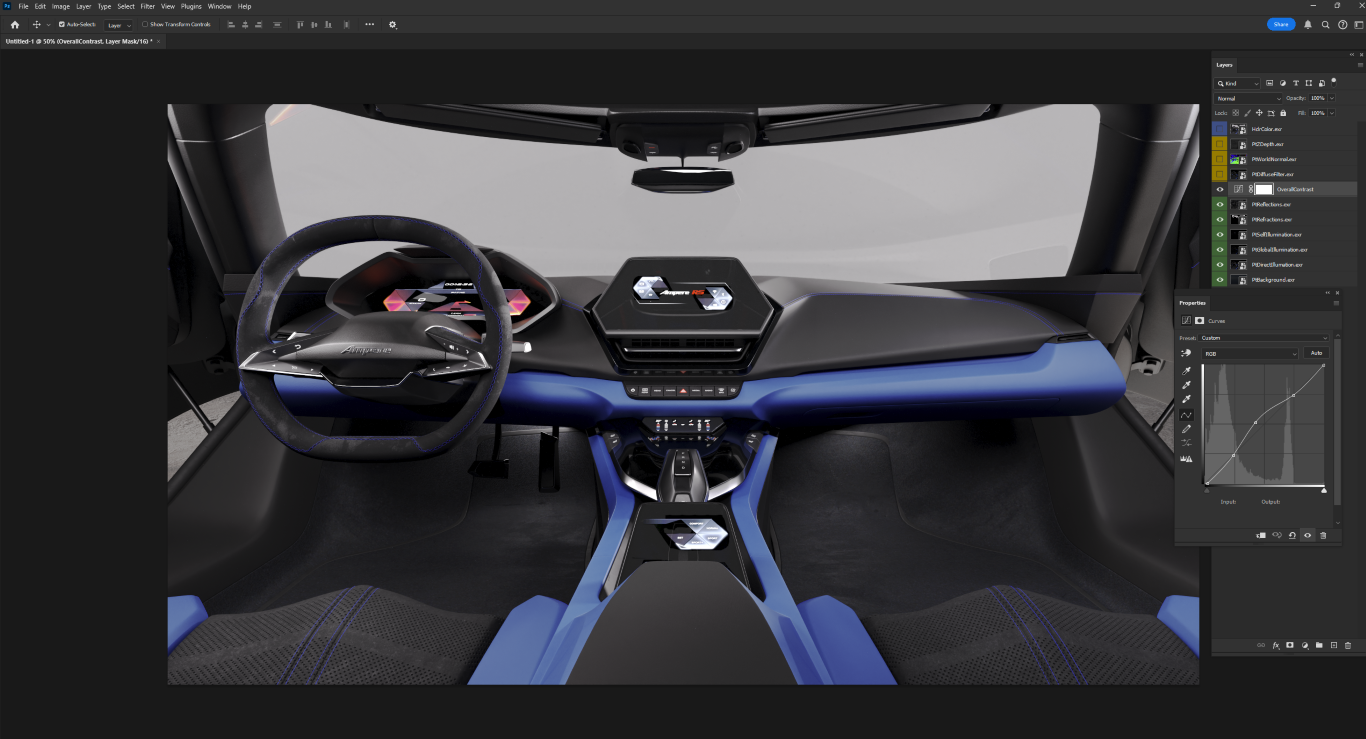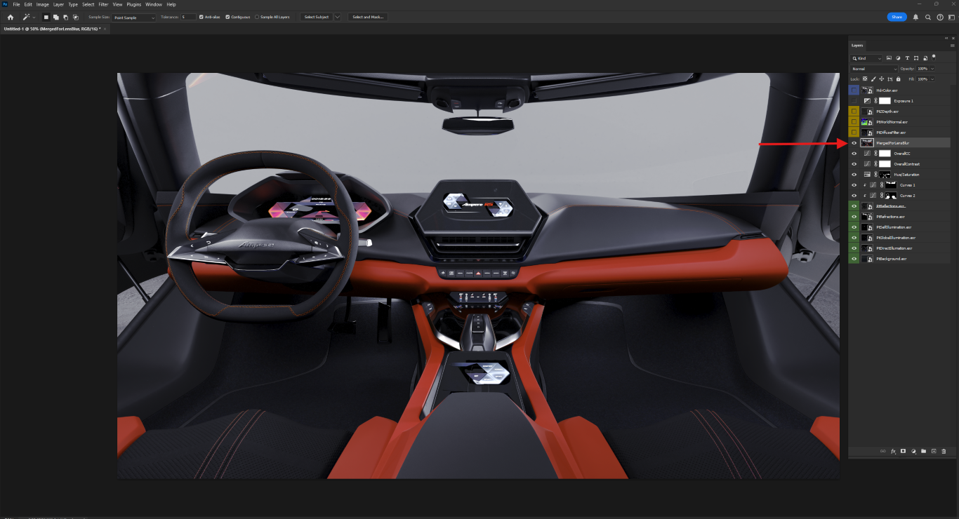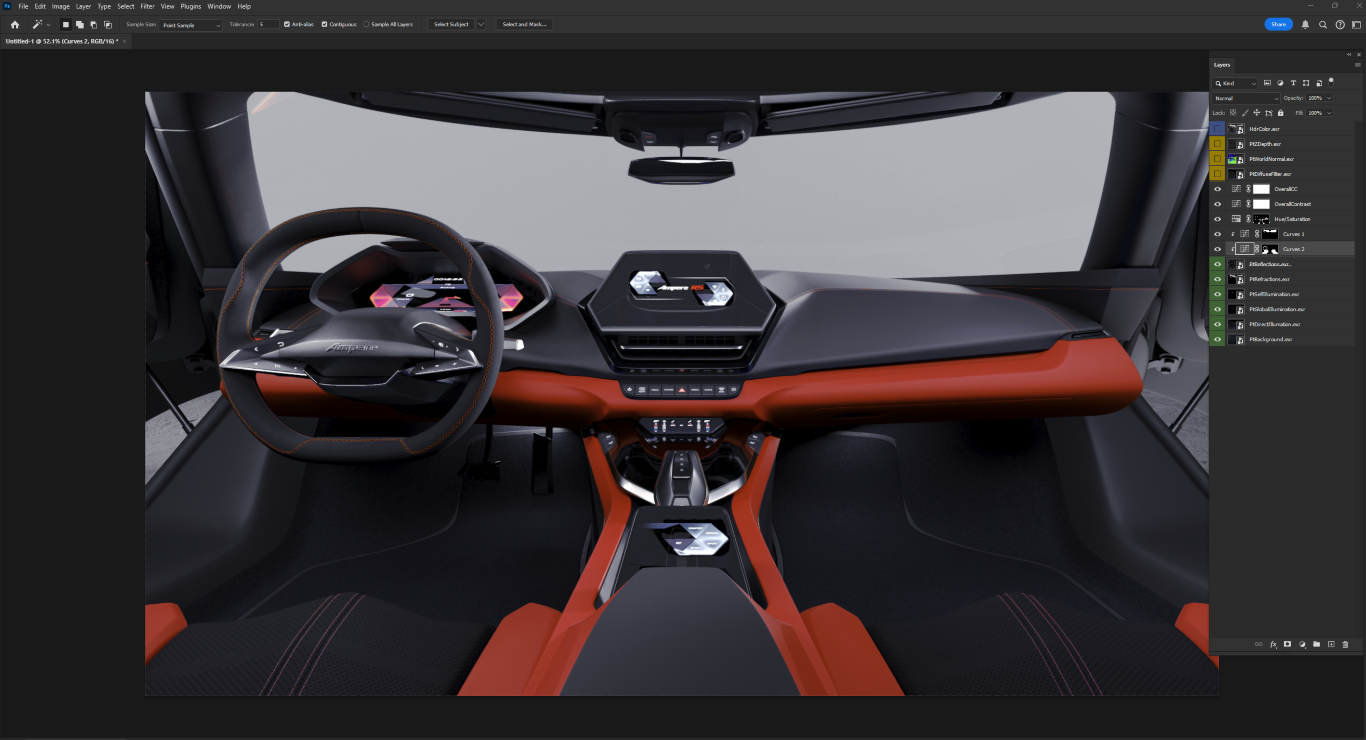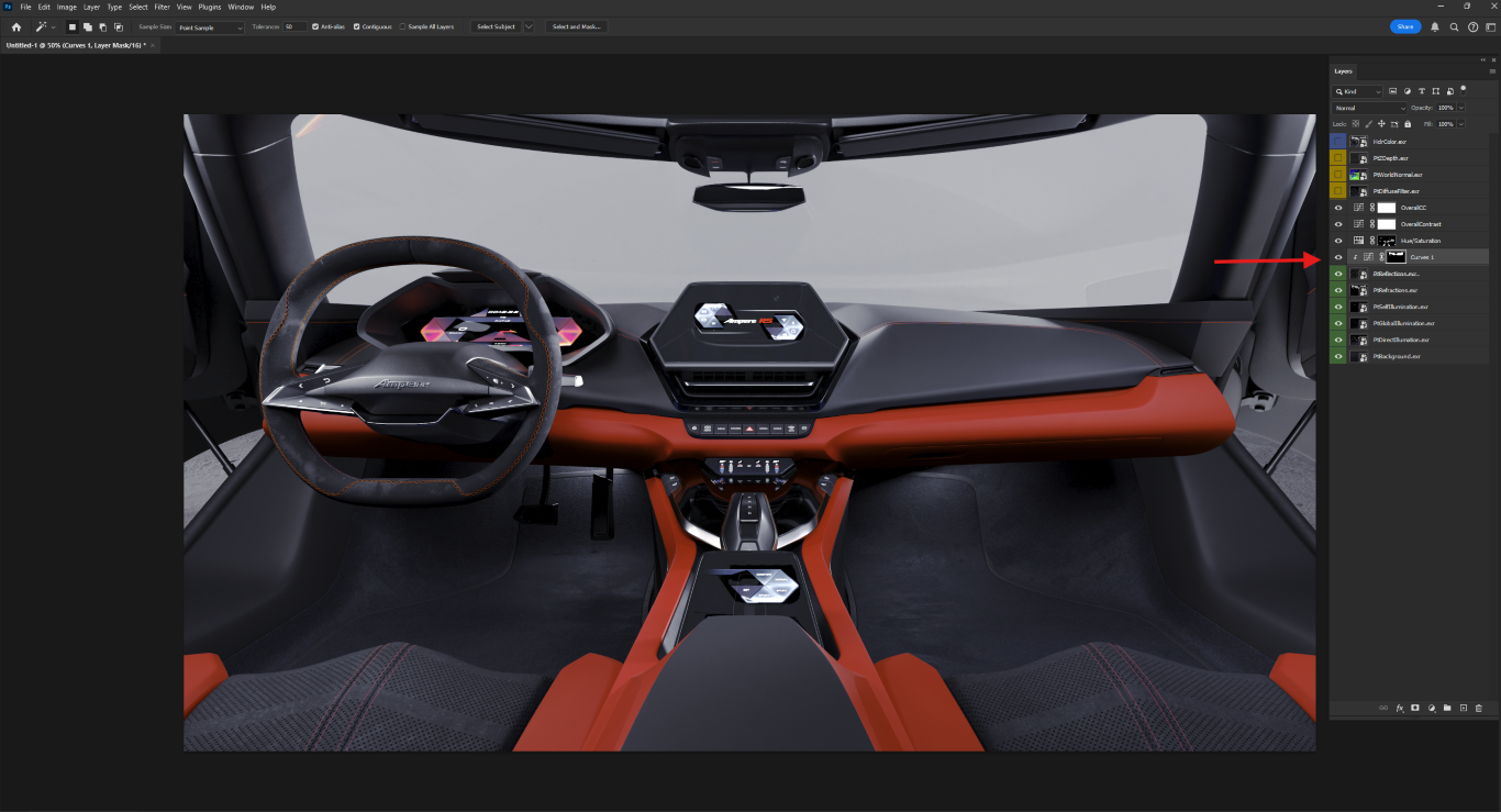 Any number of corrections can be made by repeating these steps. Here a selection has been made from the DiffuseFilter pass of the dark material of the steering wheel as well as the foot well carpets. A curves adjustment layer has been added and linked to the Reflections layer to reduce the contrast of the areas selected.