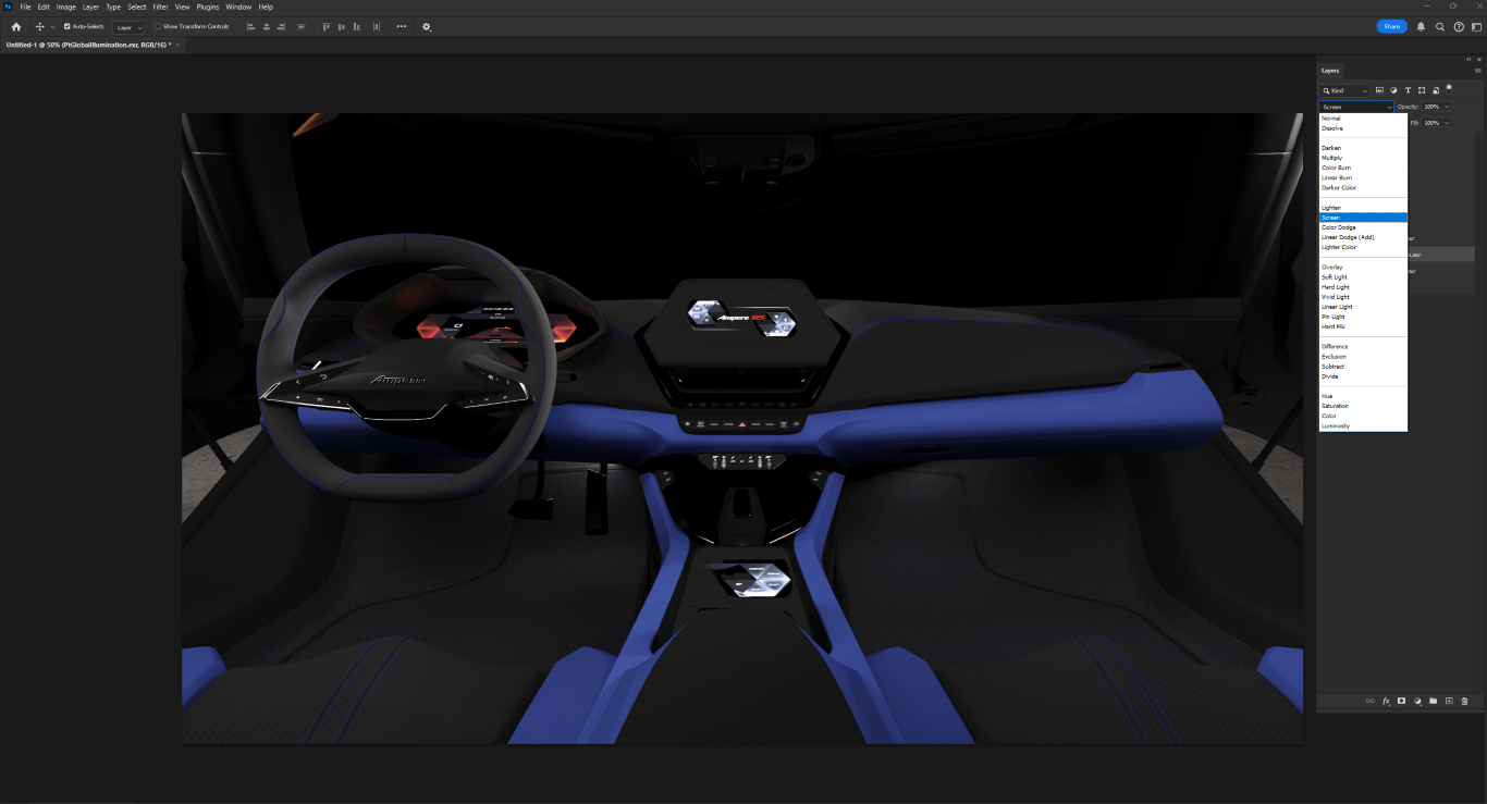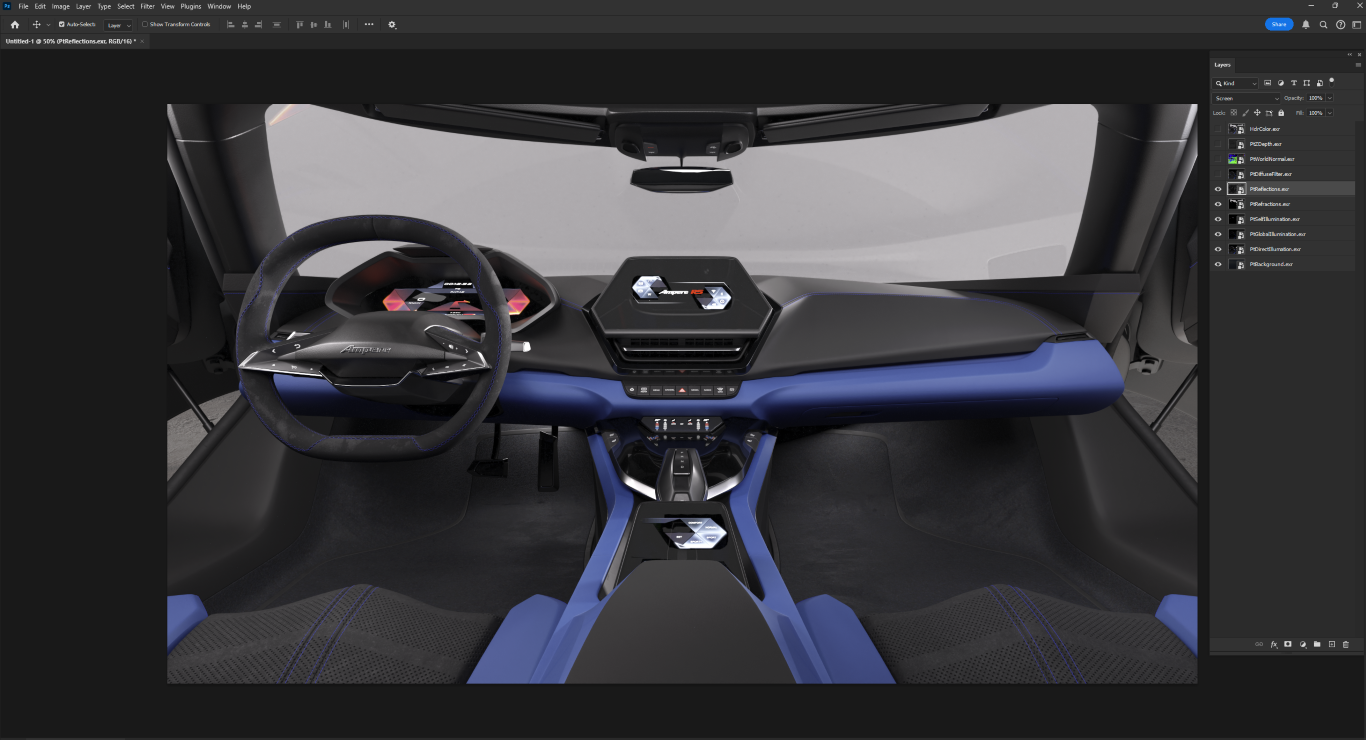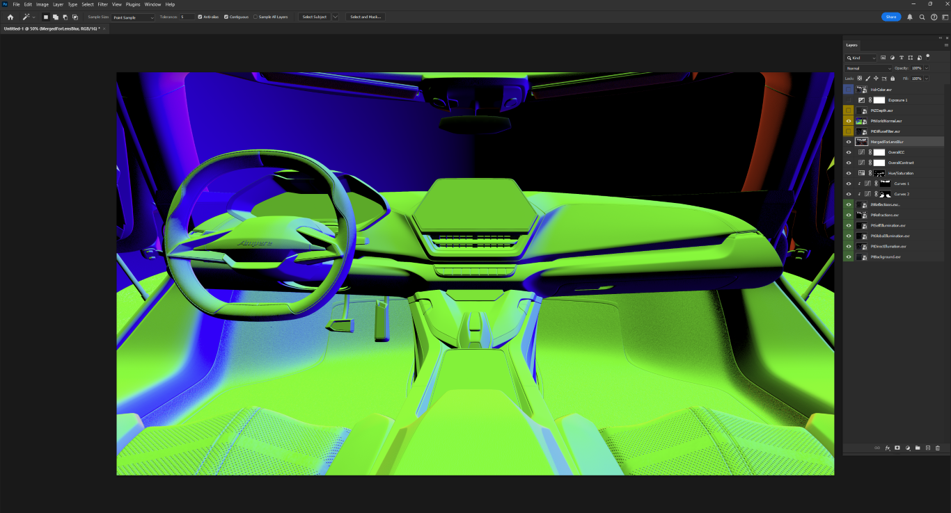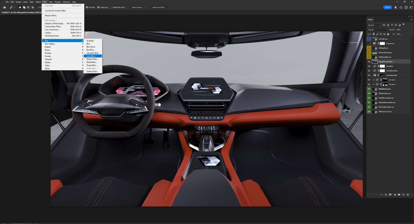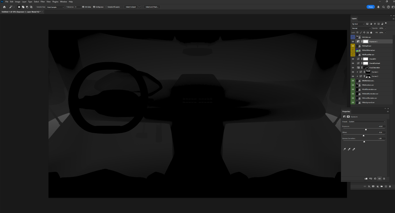 Any number of corrections can be made by repeating these steps. Here a selection has been made from the DiffuseFilter pass of the dark material of the steering wheel as well as the foot well carpets. A curves adjustment layer has been added and linked to the Reflections layer to reduce the contrast of the areas selected.