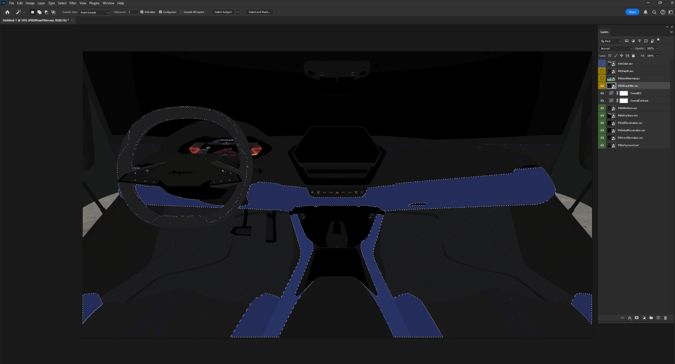 Unhide the DiffuseFilter layer, and make a selection from it of the blue seats and IP elements using your preferred method. For this example color range fromt he select menu was used.
