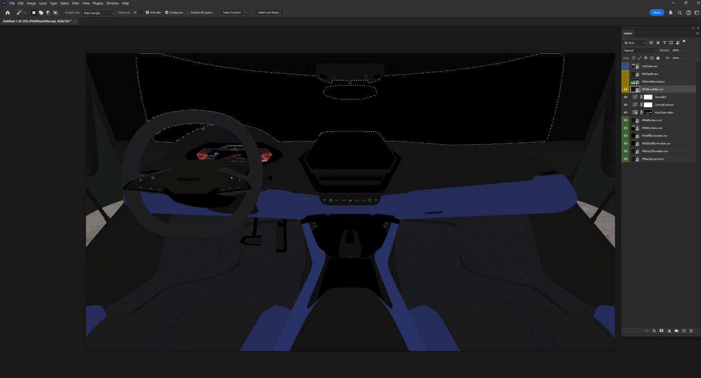 Similarily it is possible to create corrections to individual layers within in the rebuild. In this example the intensity of the window reflections will be adjusted. Create a selection of the windshield opening, for this example the magic wand was used with a tolerance of 5 sampling the bright pixels from the Refraction pass.