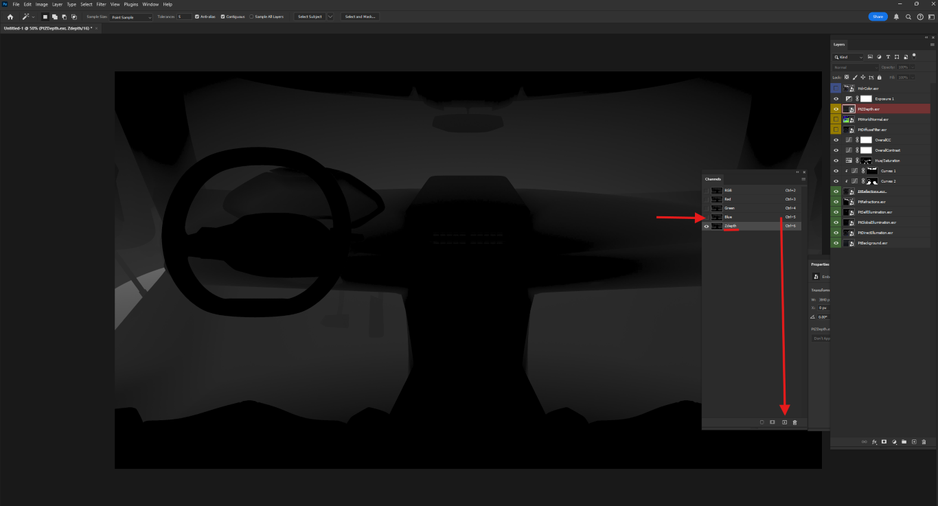 The Zdepth layer contains data regarding the distance of objects from the lens of the render camera. It can be used to add a simulated depth of field to flat image. The Zdepth layer in our working 16bit file now has the same contrast as seen in the 32bit smart object.